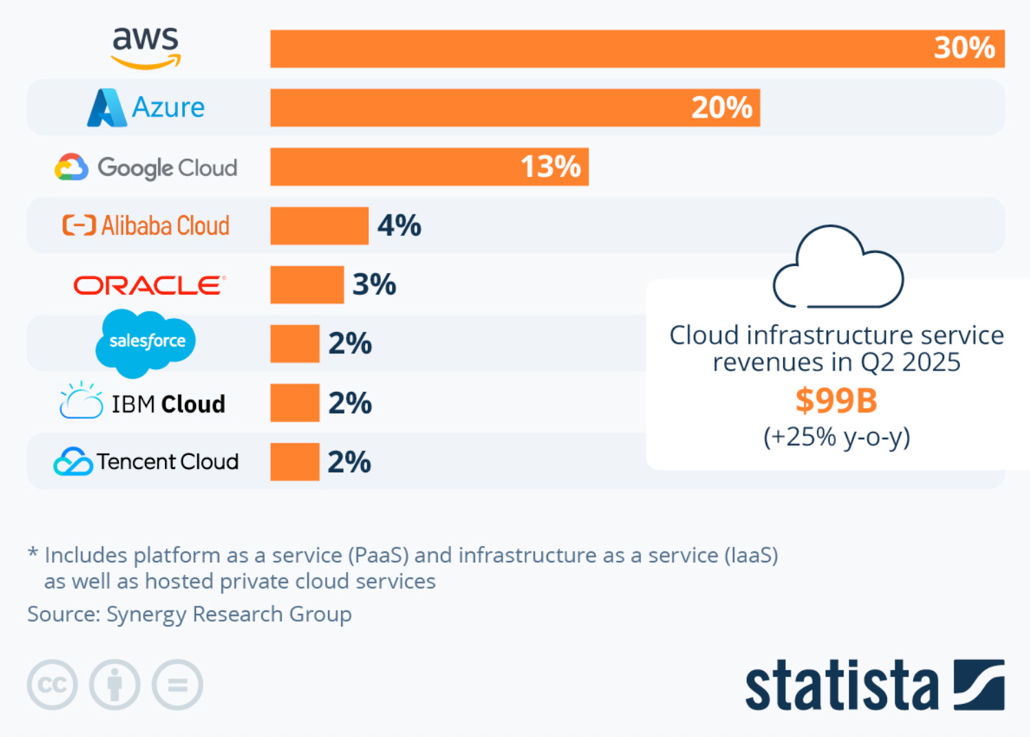 When it comes to the cloud, platforms like AWS (Amazon), Azure (Microsoft), and Google Cloud don’t just provide storage space or computing power — they’ve become the lifeblood of the global digital economy. According to the latest estimates, AWS alone powers around 30% of the global cloud market. If we include the other two, they control nearly two-thirds of it.